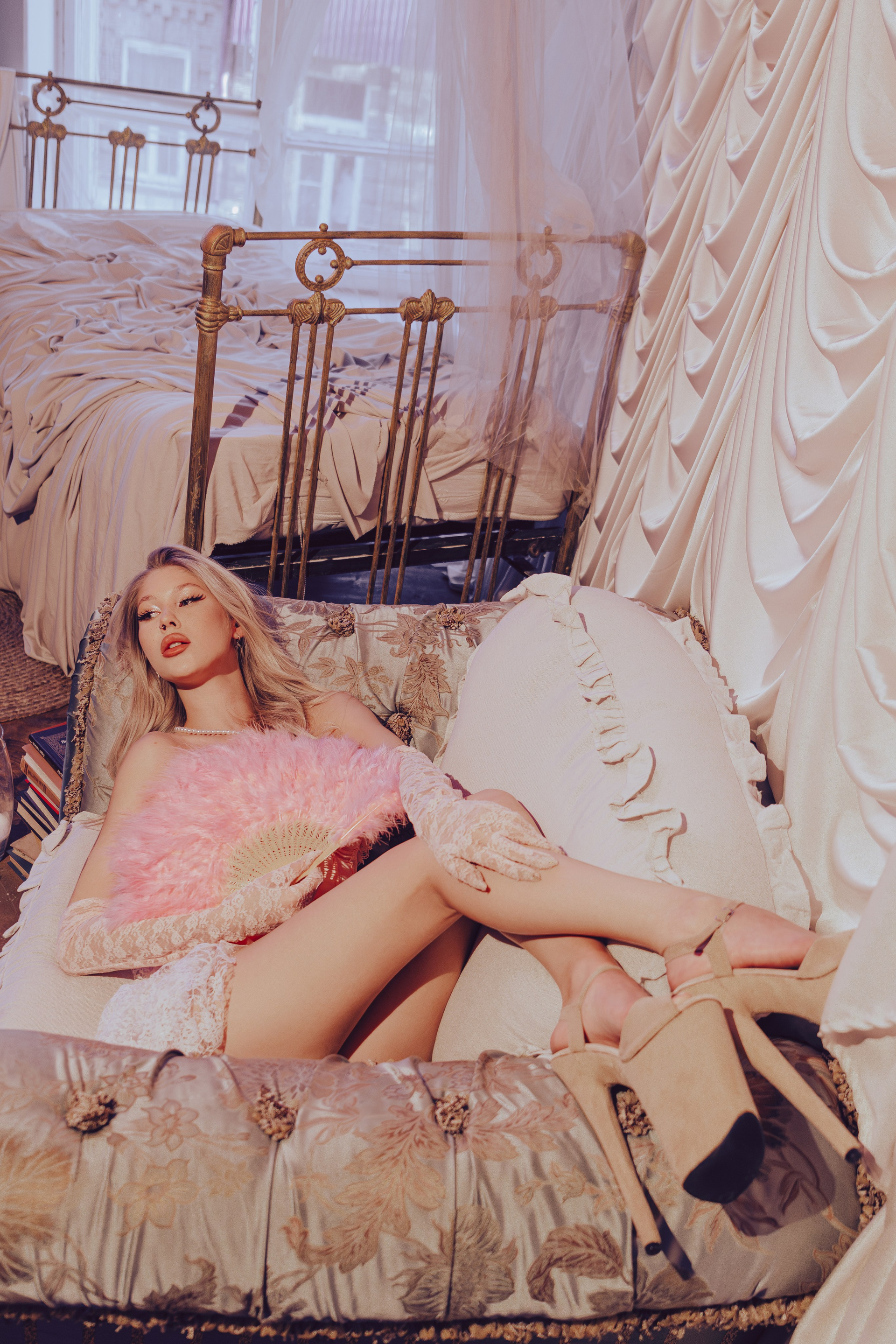 3 часа я разбил на несколько этапов: — Делаем индивидуальные кадры каждой прекрасной модели. Тут я работал со светлой локацией и разными предметами студии: кровать, окна, зеркало, кресло и т.д;